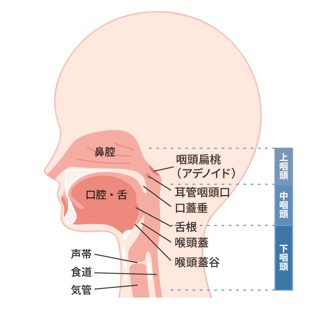 咽頭がんは、咽頭(鼻の奥〜のどにかけての部分)にできるがんです。がんが発生する位置によって、次の3つのタイプに分けられます。