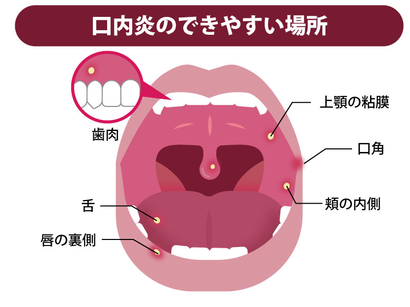 口内炎(こうないえん)とは、口の中の粘膜にできる炎症や潰瘍(かいよう)のことを指します。痛みを伴うことが多く、食事や会話のときに不快感を感じることがあります。口の中のいろいろな場所(舌、歯ぐき、頬の内側、唇の裏側、口蓋など)にできます。